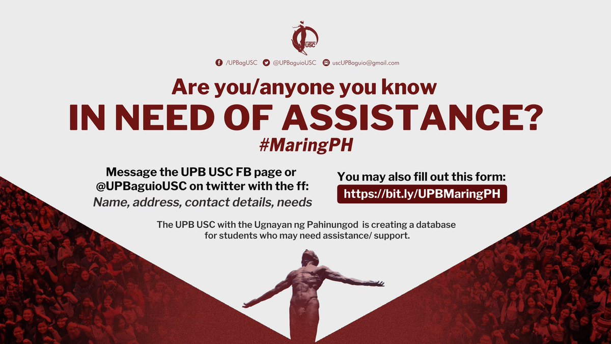 #MaringPH Are you/anyone you know in need of assistance? The UP Baguio University Student Council alongside the Ugnayan ng Pahinungod is formulating a database to find out the immediate needs of the UP Baguio community.