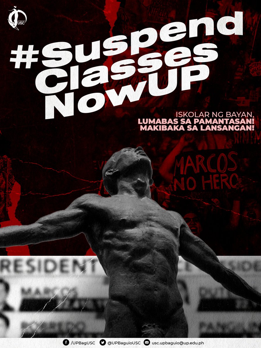#SuspendClassesNowUP Ang paglahok sa eleksyon ay isa sa ating demokratikong tungkulin upang tumindig para sa demokrasya, soberanya, at labanan ang pasismo at korupsyon. ISKOLAR NG BAYAN, LUMABAS SA PAMANTASAN! MAKIBAKA SA LANSANGAN!