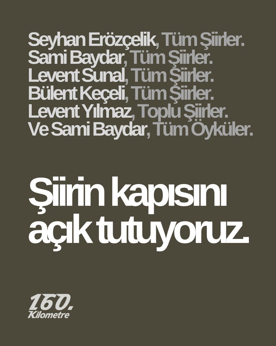 Şiirin kapısını açık tutuyoruz. Seyhan Erözçelik'in "Tüm Şiirler"i ve Levent Yılmaz'ın "Toplu Şiirler"i 160. Kilometre'de. Satın almak için: kitapyurdu.com/yayinevi/160-k…