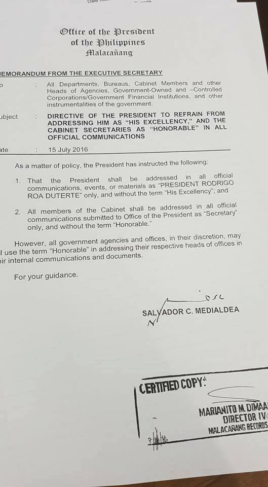 No "His excellency" for #PresidentDuterte and "honorable" for cabinet secretaries.
