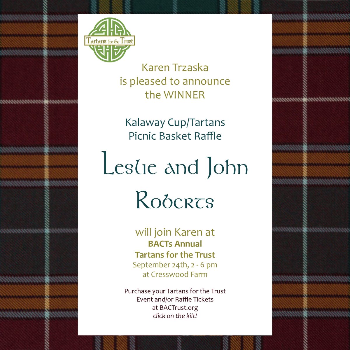 Congratulations to Leslie - she won the beautiful Tartans picnic basket at Karen's Kalaway booth!! Leslie says: "I'm sooo excited!...Yippy!!!" Join Leslie & Karen at BACT's Tartans for the Trust on Sat, Sep 24, 2-6 pm . Details at BACTrust.org ~ click on the kilt!