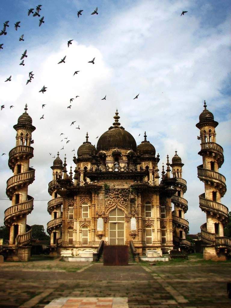 Mahabat Maqbara,Junagadh cemetery of Nawabs ,built by Nawab Bahadur Khan ji III for his father Nawab Mahabat Khan II(1851-82) ,topped with Silver doors and intricate architecture ,minarets encircled by spiralling stairways, fine example of Indo-islamic Architecture in Gujarat.