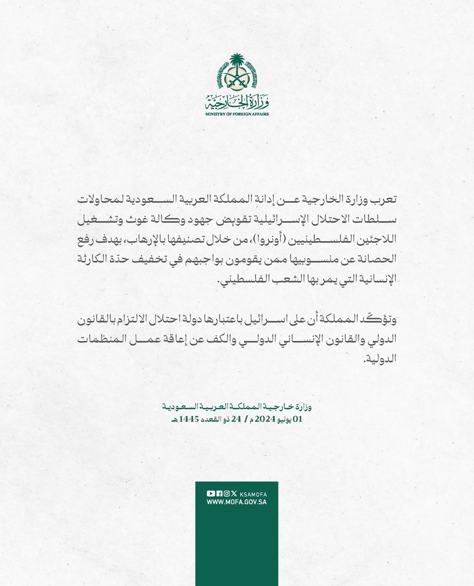 #بيان | تعرب وزارة الخارجية عن إدانة المملكة العربية السعودية لمحاولات سلطات الاحتلال الإسرائيلية تقويض جهود وكالة غوث وتشغيل اللاجئين الفلسطينيين (أونروا)، من خلال تصنيفها بالإرهاب