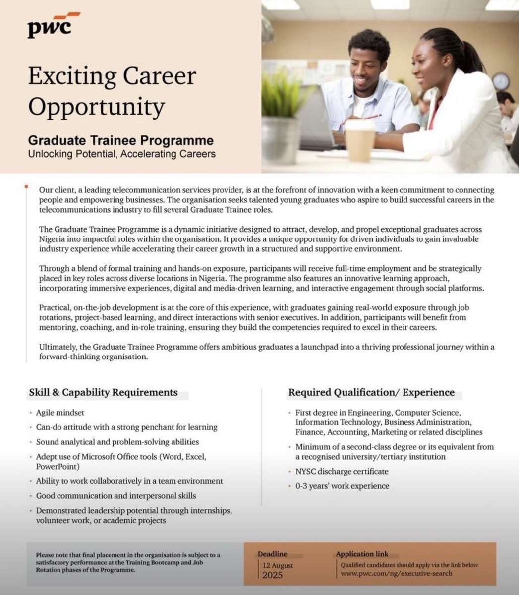 PwC is recruiting graduates for a telecommunications company 2:2 included You may want to give it a shot