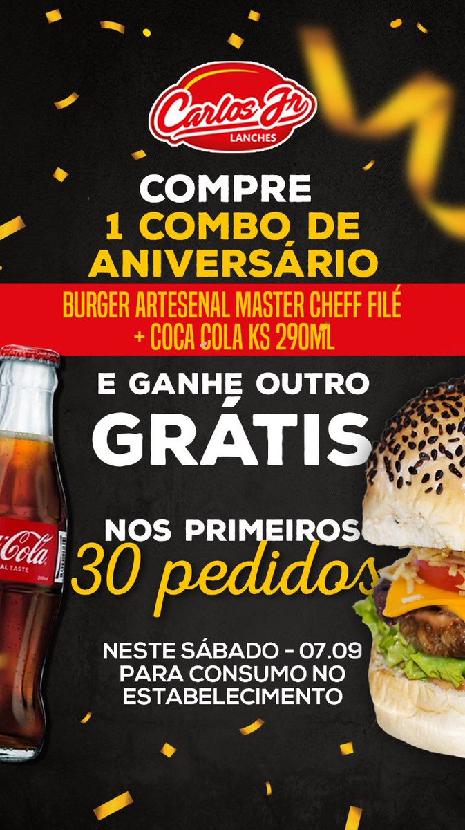 Hoje é o dia do cliente! ❤️ Em comemoração, os primeiros 30 clientes que chegarem e garantirem 1 combo do master cheff filé + coca ks ganha outro igual! Isso mesmo, paga um e ganha outro! Garanta logo o seu e vem... A partir de 17:30h esperamos por vocês! @carlosjrlanches