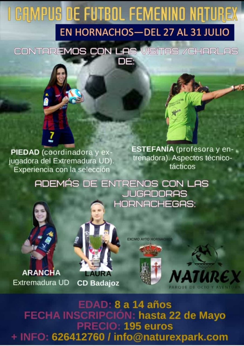 ✔ 195€(estancia completa:seguro, pernoctas en alojamientos Los Moriscos,entrenos compartidos con jugadoras del Extremadura Ud y del CD Badajoz,partido con el equipo femenino de la localidad,actividades multiaventura,visitas guiadas,charlas con profesionales,piscina,equipación..