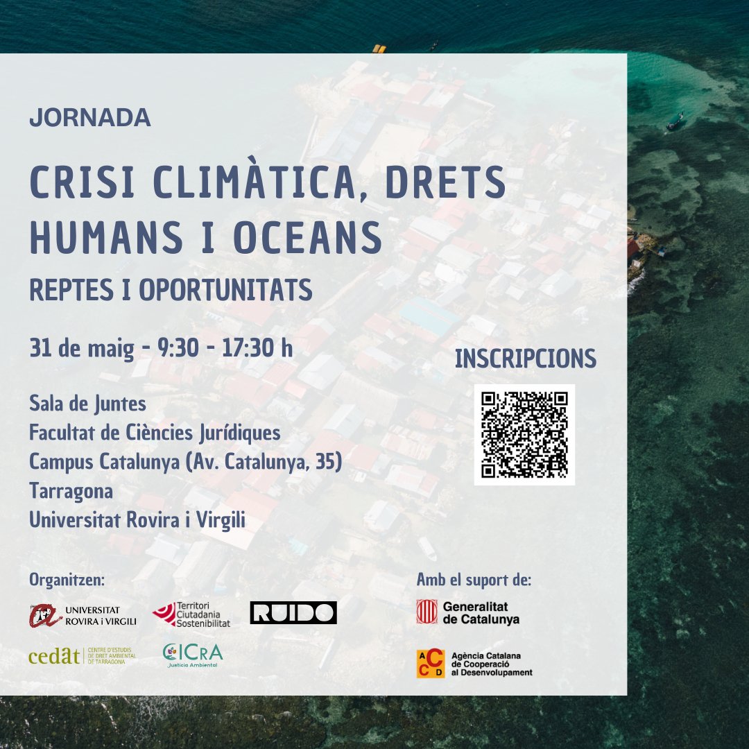 Presentem la jornada "Crisi Climàtica, drets humans i oceans. Reptes i oportunitats" 🗓️ 31 de maig ⏰ 9:30 h 📍Sala de Juntes, Campus Catalunya @juridiquesURV (Tarragona) Inscripcions: forms.gle/zucarig6H7PKTv… (1/6)