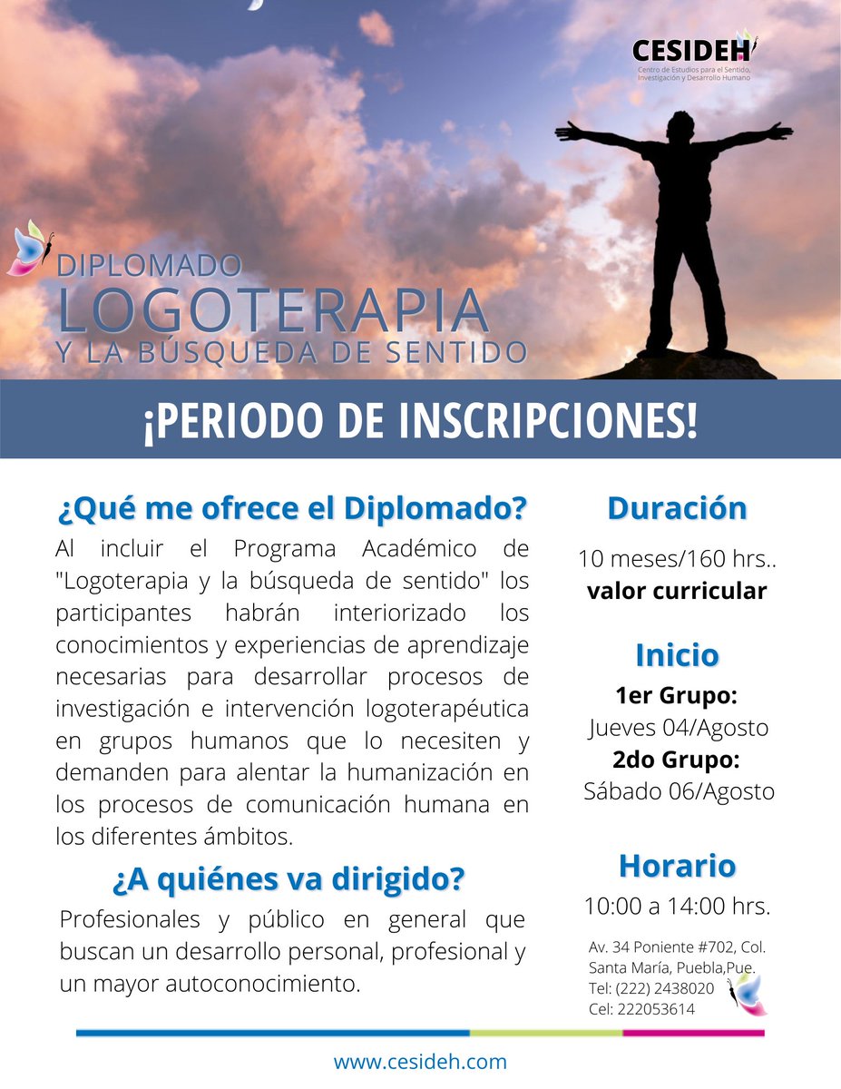 El Centro de Estudios para el Sentido, Investigación y Desarrollo Humano (CESIDEH) te invita a formar parte de los Diplomados en "LOGOTERAPIA" y "TANATOLOGÍA" 👉🏼 ¡Agenda tu entrevista y reserva tu lugar‼️ 🔔 INFORMES: 📱 2222053614 ☎️222 2438020 #cesidehpuebla #Puebla #México