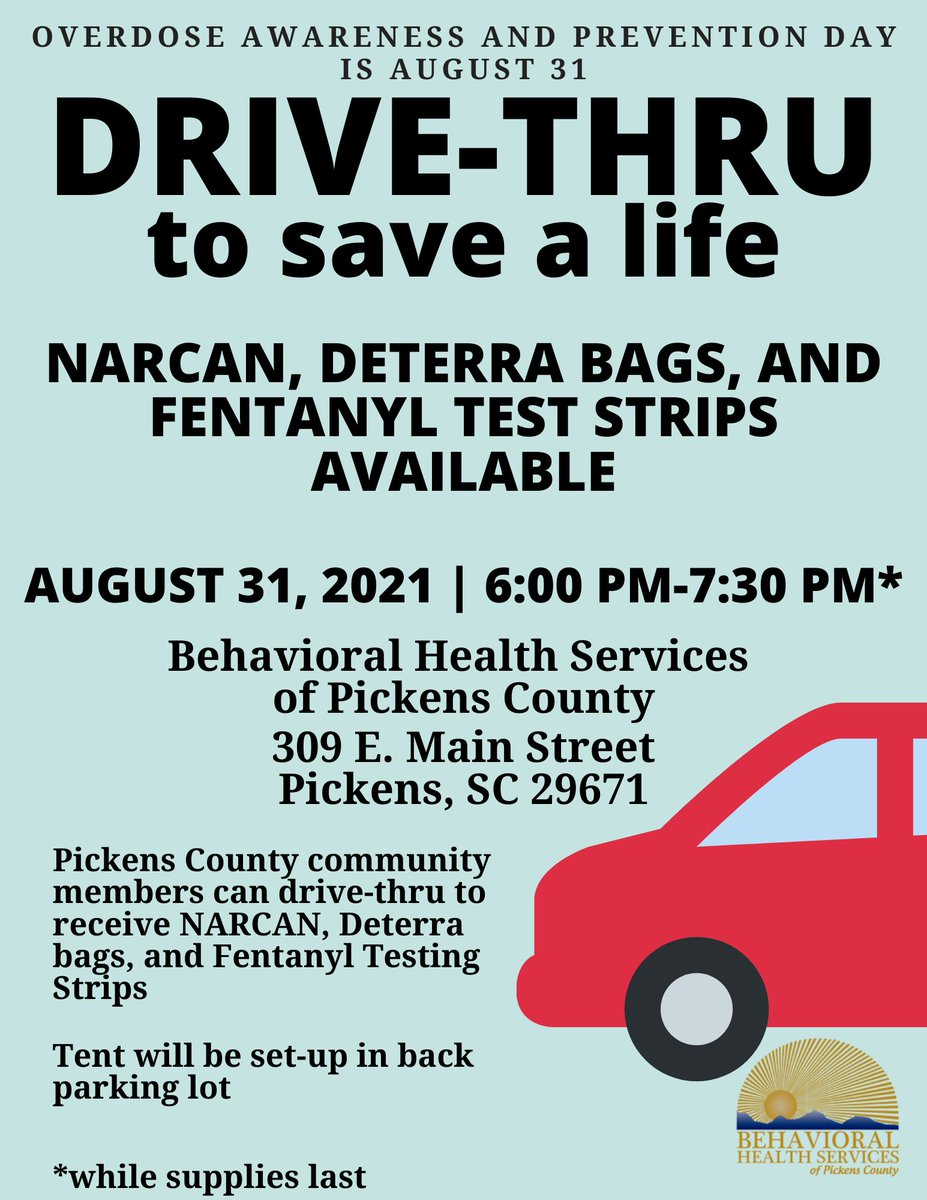 Overdose Awareness Day is August 31 and Behavioral Health Services of Pickens County is hosting a drive-thru event to save a life. They'll be giving away Narcan, Deterra bags and fentanyl test strips.