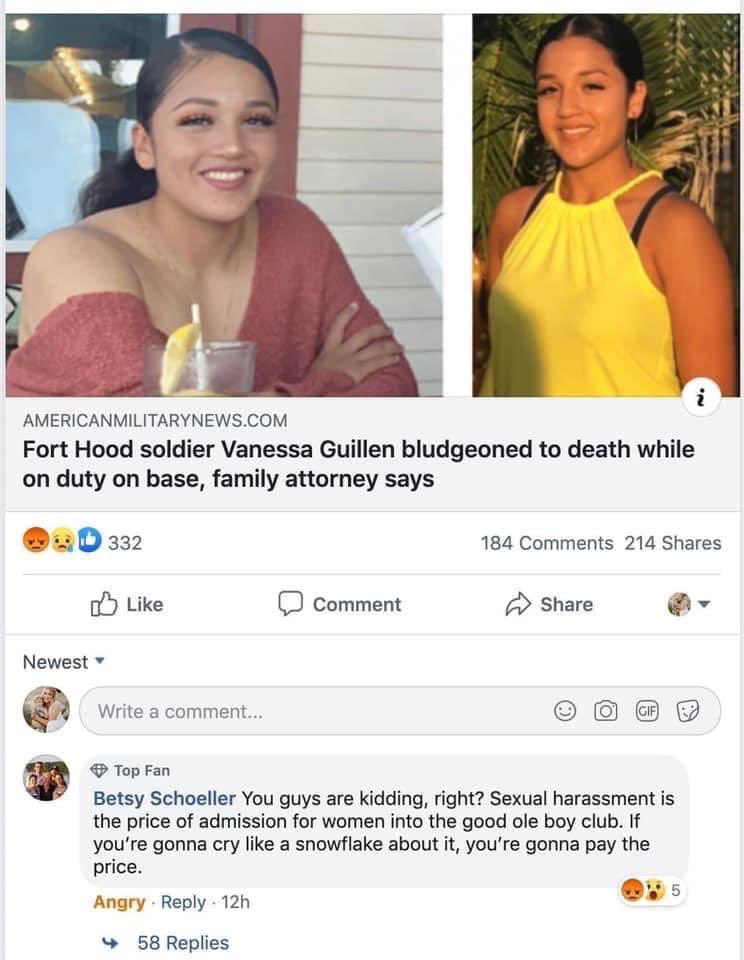 EXPOSE Air Force Lt. Col. Betsy Schoeller of Milwaukee, WI. These are her comments regarding an article about the murder of Vanessa Guillen and the sexual assualt she told her family and friends about. She should not be in any position of leadership.