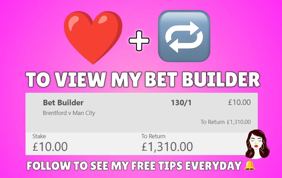 Everybody who ❤️ and retweets this tweet will be able to see my bet builders today! 🫶 I have a special surprise at 4PM today for everyone who has my notifications on and follows me🔔 I have landed 781/1, 196/1 and 130/1 bet builders recently, who fancies some more tonight? 👀 https://t.co/mGWsd15qZp