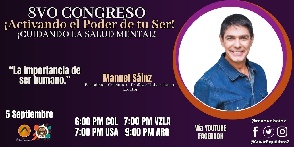 En el 8vo Congreso Internacional Vivir Equilibra2, acompaña a @ManuelSainz Periodista - Consultor - Profesor Universitario - Locutor: con su ponencia “La importancia de ser humano.” #VivirEquilibra2 #CongresoSaludMental #ActivaTuSer