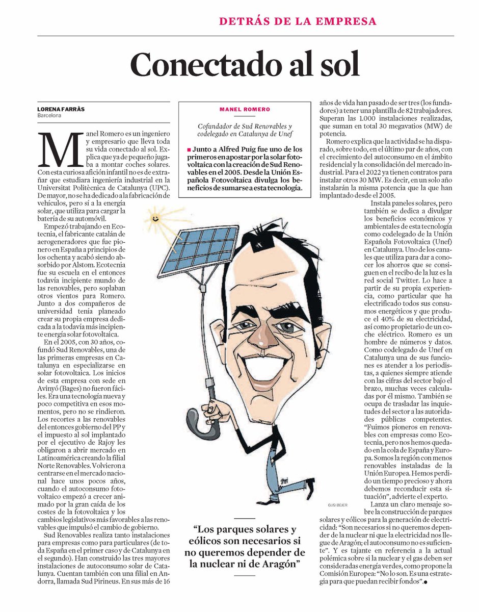 La Vanguardia ha dedicado un perfil profesional a Manel Romero, socio cofundador de SUD Renovables y codelegado de Unefcat @UNEFotovoltaica #autoconsumo #renovables #solar #fotovoltaica