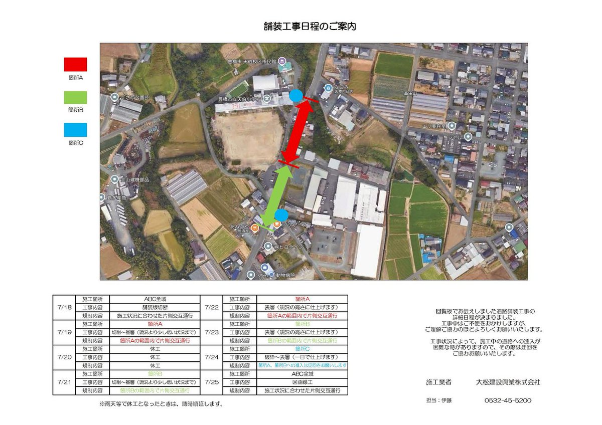 おはようございます。 近隣との調整の関係で土曜日と祝日に珍しく工事をさせていただきます。 天伯小学校前面の道路で舗装の打ち替えを本日より一週間かけて行います。 お急ぎの方は迂回等のご協力をお願いいたします。