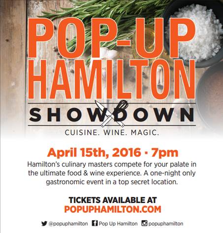 April 15th Pop Up: Showdown. Four chefs. Four wineries. One unforgettable night! Tickets: popuphamilton.com