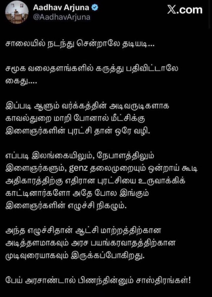 #AadhavArjuna 's X-post (now deleted) calling for violence by TN Youth like Nepal and Srilanka is morally reprehensible and highly condemnable.. Hope Hon CM @mkstalin and @tnpoliceoffl initiate legal proceedings against him.. 🙏