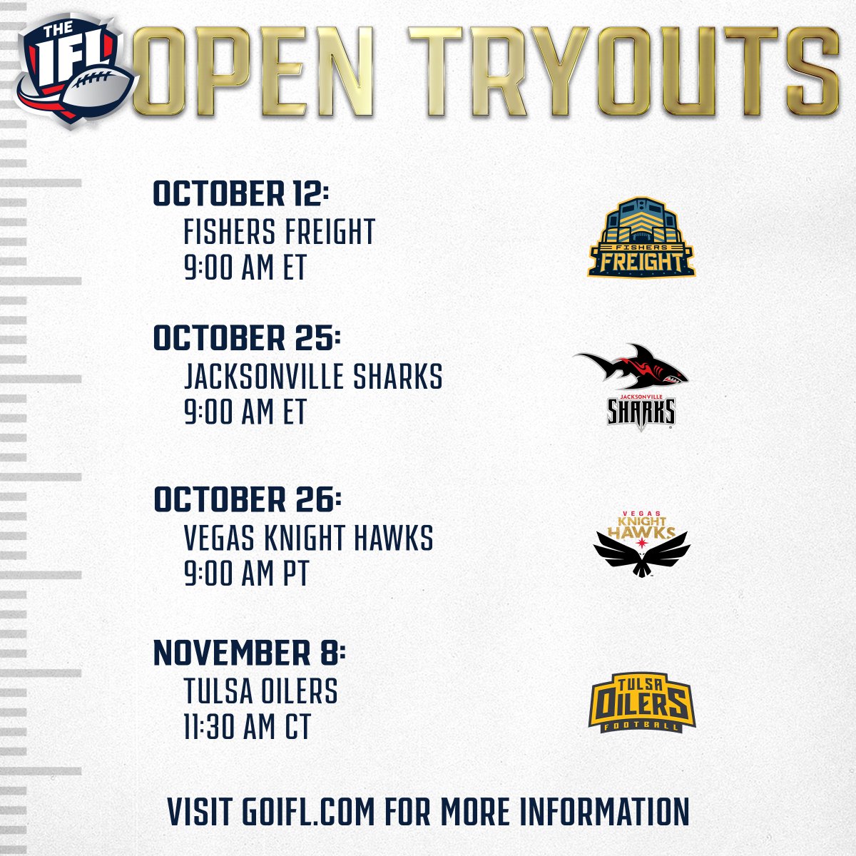 🚨 OPEN TRYOUTS ARE HERE 🚨 Your shot to go pro starts NOW. The @FishersFreight, @jaxsharks, @KnightHawksIFL and @tulsa_oilers_fb are giving athletes the chance to prove they belong in the IFL. 🏈 Do you have what it takes? Visit GOIFL.com for details.