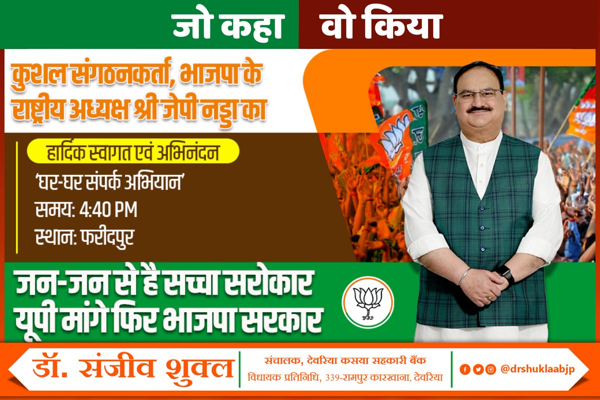 जनता के विश्वास से यूपी में फिर खिलेगा कमल राष्ट्रीय अध्यक्ष श्री जे पी नड्डा आज ‘घर-घर संपर्क अभियान’ के तहत जनता को बताएंगे भाजपा सरकार के अभूतपूर्व विकास कार्य। सोच ईमानदार काम असरदार यूपी फिर मांगे भाजपा सरकार #घर_घर_भाजपा