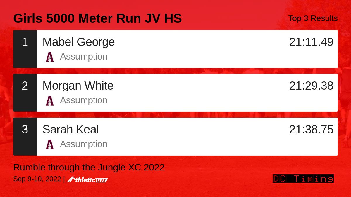 Full results for the Girls 5000 Meter Run JV HS are available. dc.anet.live/8oqx5y Rumble through the Jungle XC 2022 #rumblexc #rumble22 #dct
