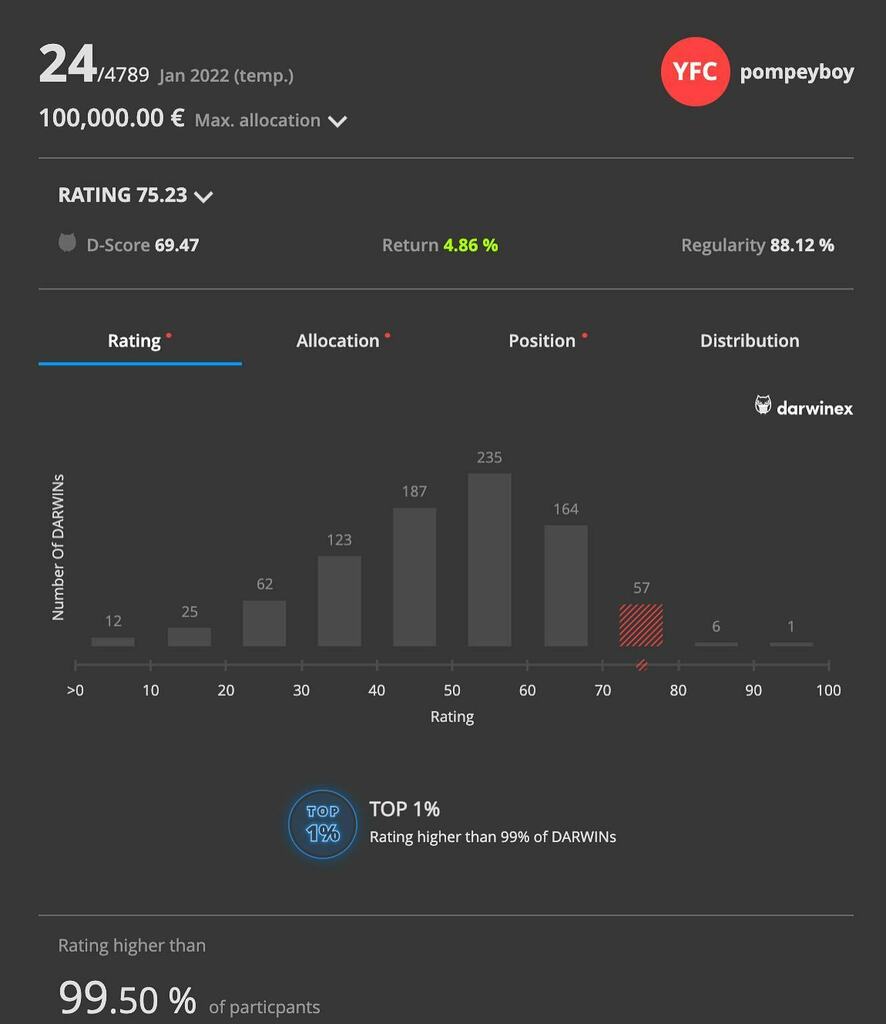 After a two month hiatus where the markets pummeled our algo portfolio.. we are climbing back! So far, almost a 5% return on the #Darwinex platform in January 2022 and we are currently tracking 24th out of 4789 other portfolios this month which is apparently higher than 99.5…