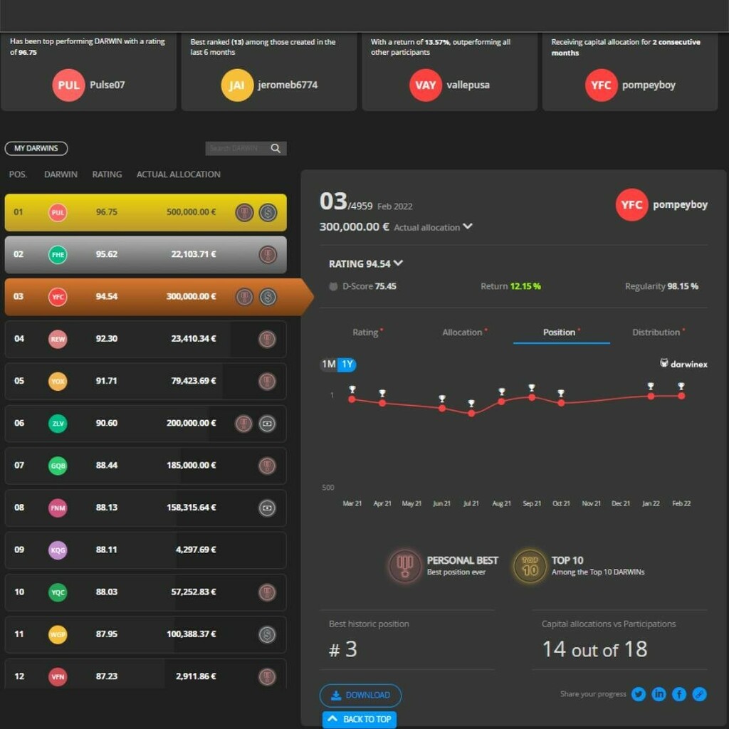 I really like the new #Darwinex dashboard.. looks really great and even better with our algo portfolio YFC taking the number 3 position out of 4959 other portfolio. Our algo portfolio also got the 'best streak' badge for winning allocation last month - w… instagr.am/p/Caj3DtTtJHQ/