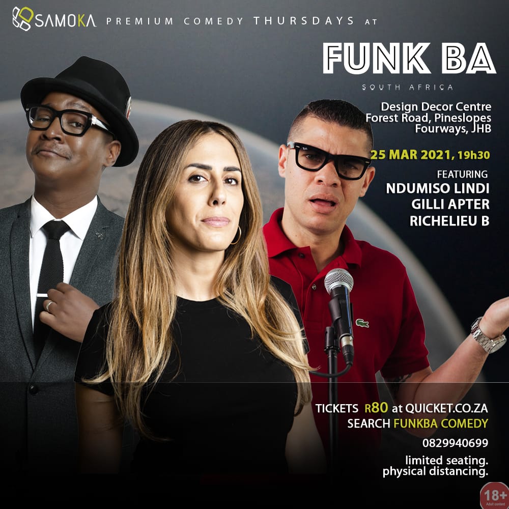 Premium Comedy Thursdays Brought to you by @SAMOKA_SA and @funk_ba Featuring @NdumisoLindi, @gillog, @richelieub Tickets from R80 and seats are limited so book now - qkt.io/FUNKBA-25Mar21 Enquiries - 082 994 0699 No under 18's - Physical Distancing