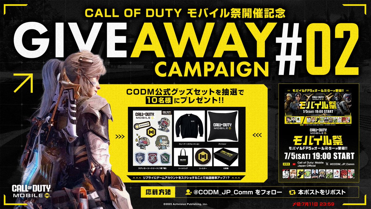 /🎉7/5 モバイル祭開催記念!!🎉\ フォロー & リポストで抽選 10名様にCODM公式グッズを🎁 🔴YouTube: youtube.com/live/9FYs5we8H… ■応募方法 ①このポストをRT ② @CODM_JP_Comm をフォロー 番組を視聴して、 #CoDモバイル を楽しもう🔥