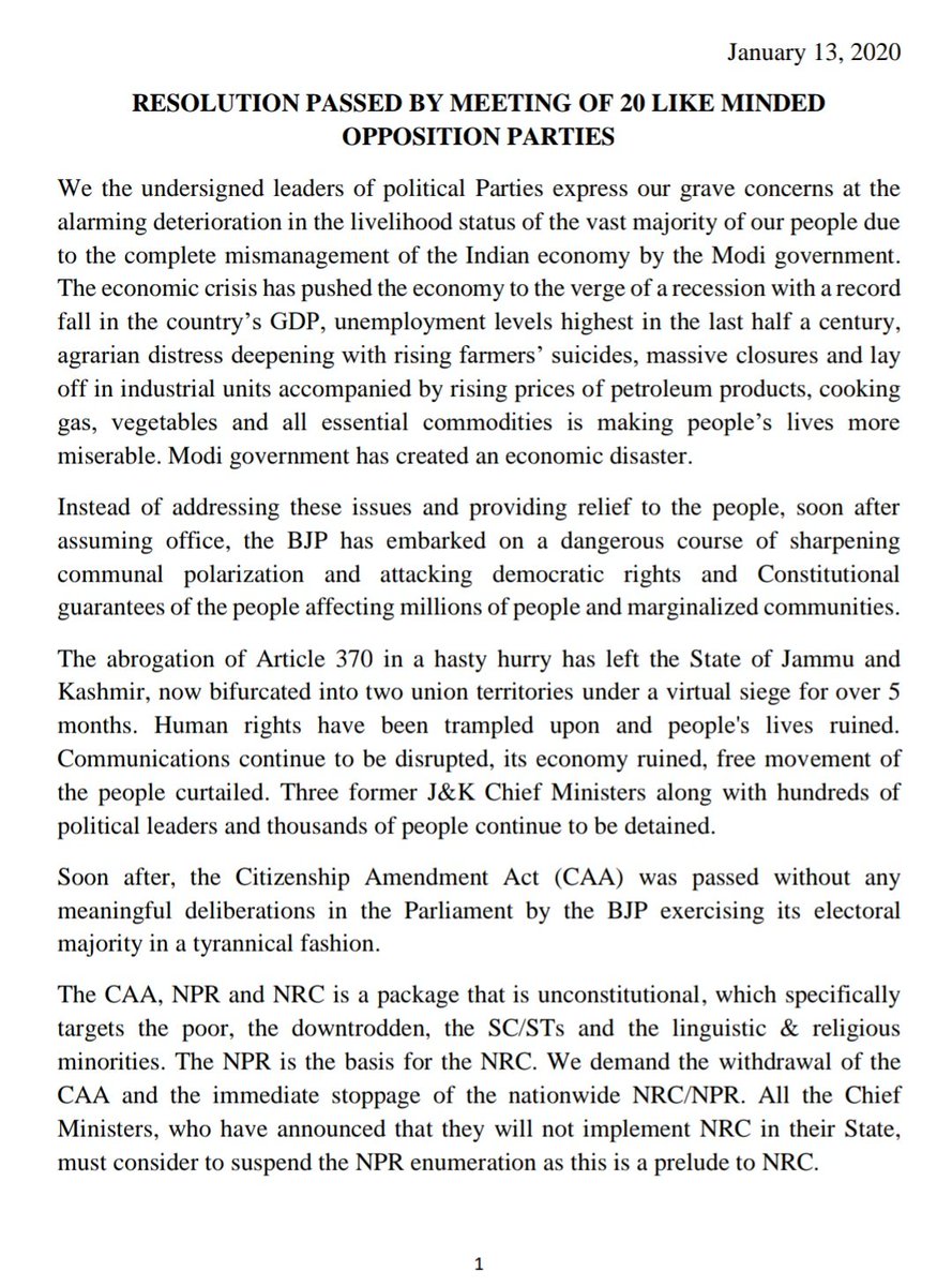 In a significant win for the movement, opposition parties resolve that all CMs, who have announced that they will not implement NRC, must consider to suspend NPR enumeration. Significant, as a clandestine NPR along with Census would have meant NRC by default. #Zindabad