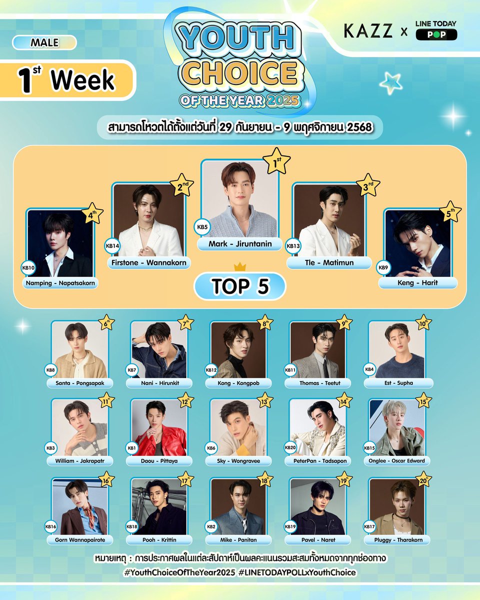 📝 คะแนนสัปดาห์แรกออกมาแล้ว ( 🤳🏻💘 * ) อันดับที่ 1️⃣ : “ Mark - Jiruntanin ” อมก อันดับหนึ่ง ! มีมี่ทุกคนเก่งมาก ㅠ ㅠ รักษาอันดับพามาร์คจิรันไปรับรางวัลกันต่อน้า โหวตได้ถึงวันที่ 9 พฤศจินะคับผม 🥺 ( 🏆🗯️ ) #YouthChoiceOfTheYear2025 𓂃 ꒰ #markjrtn , @Markjrtn ♡ 𓈒 ݁ა ꒱ 𓂂𓏸