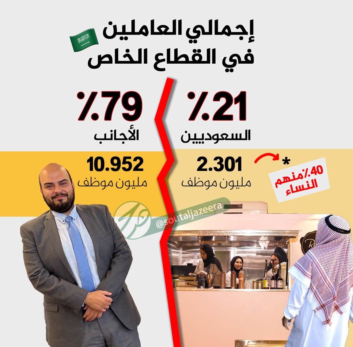 🔴مرصد العمل: إجمالي العاملين في #القطاع_الخاص 🔸 بلغ عدد الأجانب العاملين في هذا القطاع 10.952 مليون موظف، يمثلون 79% من القوة العاملة في القطاع الخاص. 🔸في حين بلغ إجمالي عدد المواطنين العاملين في القطاع الخاص في شهر أكتوبر الماضي، 2.301 مليون موظف، يمثلون نحو 21٪ من القوة…