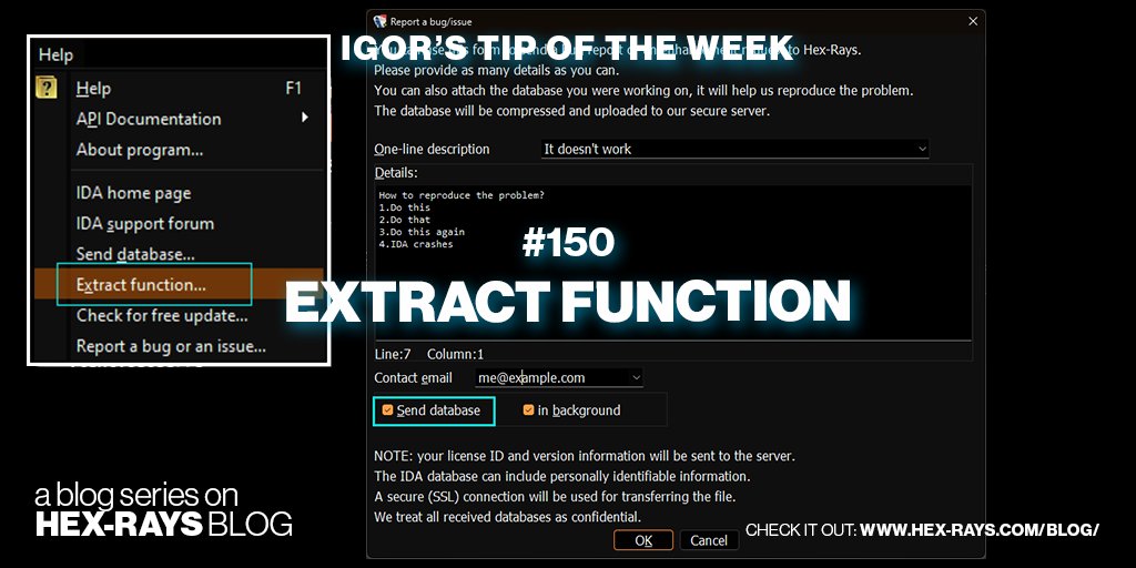 Found a bug but can’t share the whole database? Try this feature 🌐 hex-rays.com/blog/igors-tip… #IgorsTipOfTheWeek #IDAtips #IDAProTutorials