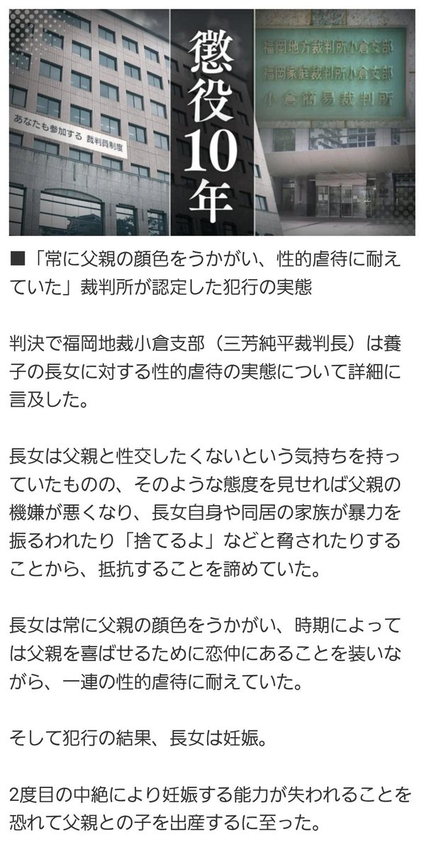 【鬼畜】養子と実子を10年レイプしまくった父親に懲役10年判決 ■50代父親 ・長女(養子)を少なくとも10歳から継続的にレイプ&DV ・次女(実子)もレイプ ・週に3〜4回のレイプも ・レイプで長女が妊娠 →一度目は中絶した長女だったが、二度目は「また中絶すると妊娠できなくなるかも」と出産を選択…