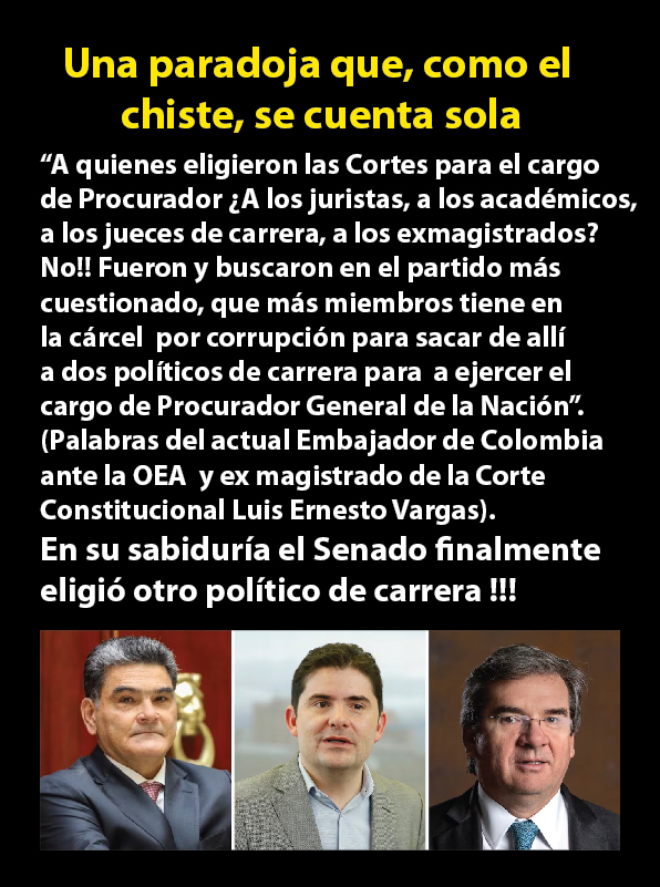 A quienes eligieron las Cortes para el cargo de Procurador ¿A lo juristas, a los académicos, a los jueces de carrera, a los exmagistrados? No!!. Fueron y buscaron a dos políticos de carrera Embajador de ante la OEA Luis Ernesto Vargas y ex magistrado de la Corte Constitucional)