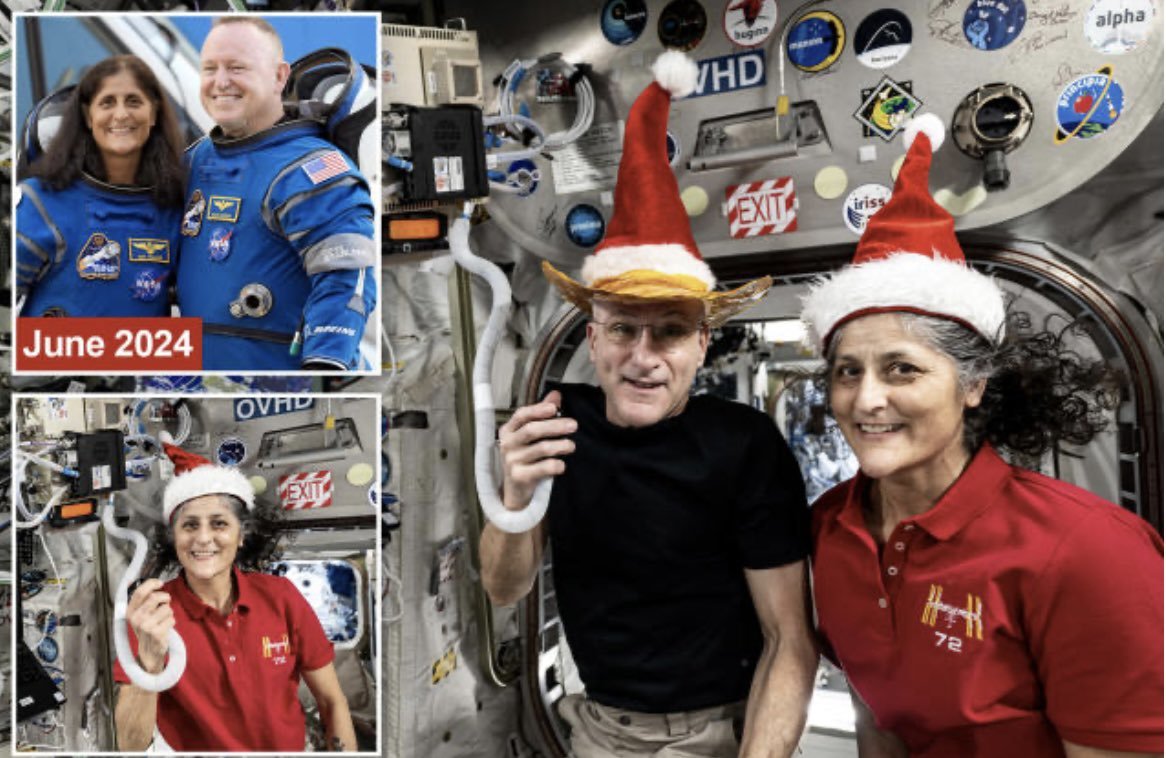 Can someone explain this one to me. These are the "astronauts" that have been stuck in space since June but somehow they are in such good spirits they decided to take a Christmas selfie. Explain to me where did they get the Christmas hats? This was supposed to be an 8 day…