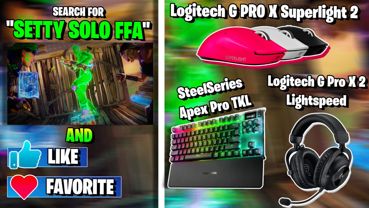 Released a SOLO Version of my FFA Map 🥰 Giving away: 1x Logitech PRO X SUPERLIGHT 2 1x SteelSeries Apex Pro TKL 1x Logitech G Pro X 2 Lightspeed Like & Retweet, Tag 2 Friends, and Comment Proof of Favoriting the map 👀 Code: 1789-3708-6765 or search "Setty" 💚