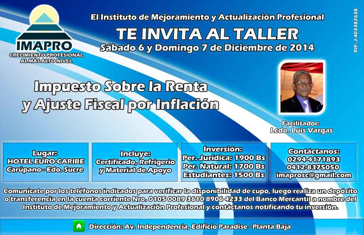 Taller ISLR y Ajuste Fiscal por Inflación. Viernes 23 y sábado 24 de enero. Mas Detalles: facebook.com/imaprosc/photo…