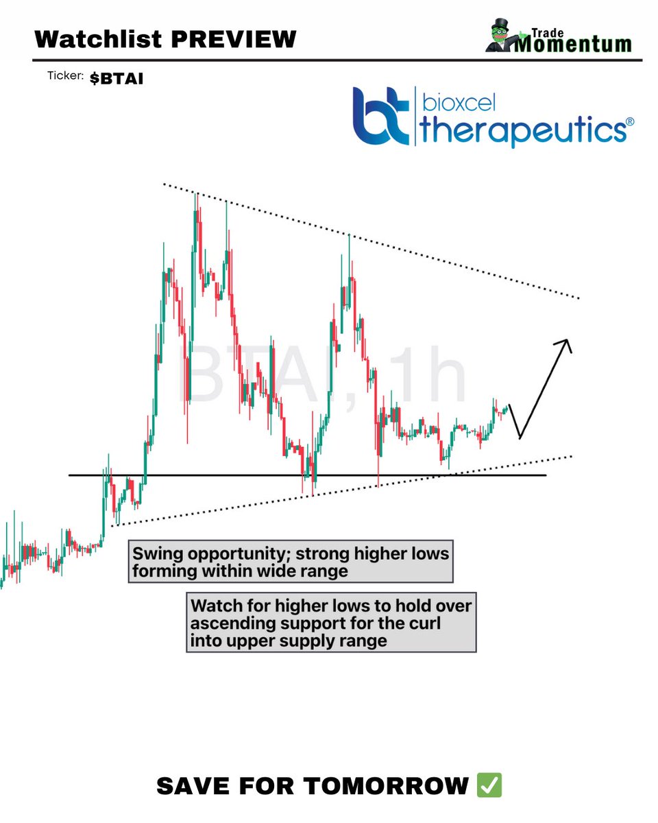 $BTAI on my watchlist, AGAIN. Took a small swing on this already, looking for continuation tomorrow. As long as this maintains higher lows within trend line support, I’ll keep this on watch. Range to $6.6, $8, $10+