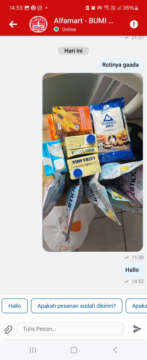 Tolong dibantu, pembelian online alfamart kurang, namun saat dichat tidak dibalas. Apakah memang ada indikasi penipuan? Saya belum menerima roti, tidaj ada konfirmasi dan pengurangan biaya. @sahabatalfamart @alfamart Masih lebih baik pelayanan @Indomaret @KontakIndomaret