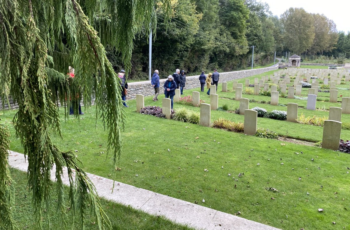 #WesternFootstepsTour. Time today @CWGC Heilly Station Cemetery for @jbanningww1 to share with relatives tales of some of the men buried in this now peaceful spot just across from the casualty arrival railway station. #FWW