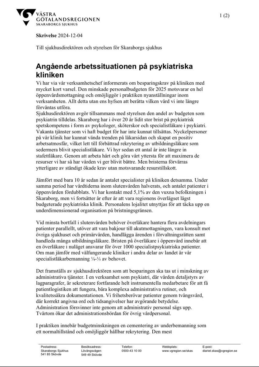 Igår, onsdag 4 december 2024, lämnande specialistläkarna vid psykiatriska kliniken vid Skaraborgs sjukhus in medföljande skrivelse till sjukhusdirektören och sjukhusstyrelsen. På grund av mångåriga, medvetna nedskärningar i psykiatrin i vår del av Västra Götalandsregionen, och…