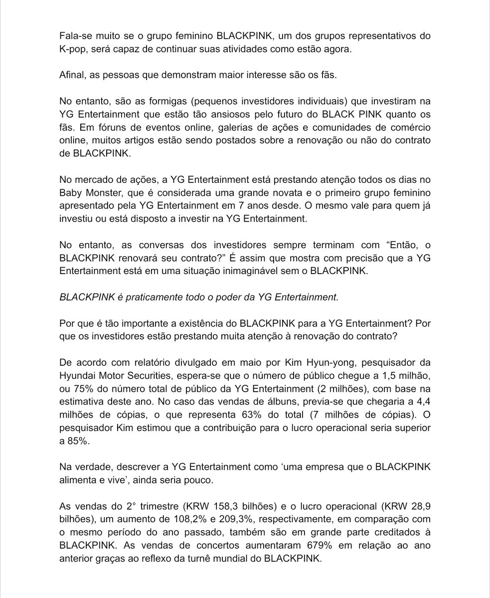 📝 LEIA: Investidores da YG então preocupados com a renovação do contrato do #BLACKPINK. "BLACKPINK é quase todo o poder da YG. Na verdade, descrever a YG Entertainment como ‘uma empresa que o BLACKPINK alimenta e vive’, ainda seria pouco." n.news.naver.com/article/016/00…