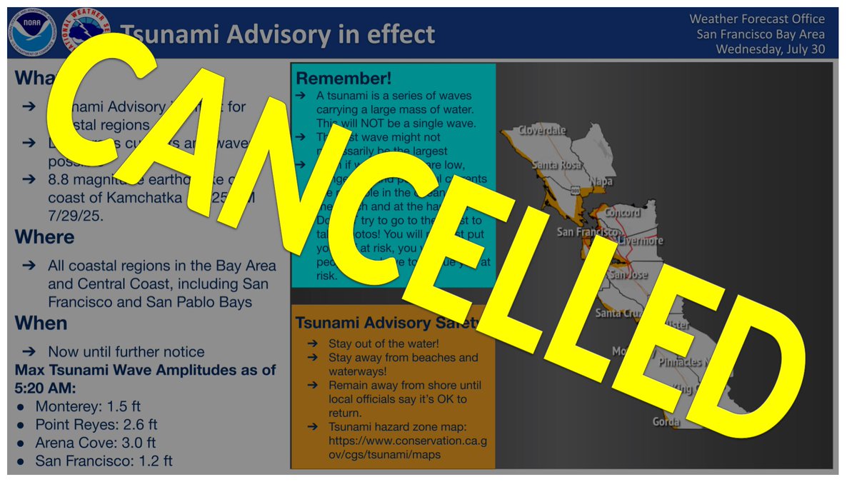 The Tsunami Advisory has been cancelled for the Bay Area/Central Coast. Tsunami products are still in effect for other portions of California. Visit tsunami.gov for details. Remain aware around the ocean today as strong currents will exist. #CAwx