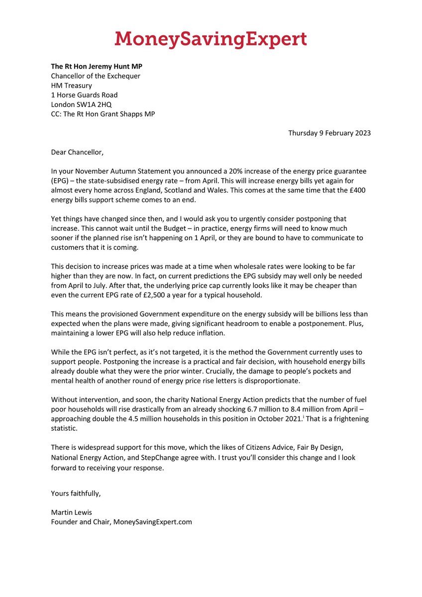 I have just sent the Chancellor @Jeremy_Hunt - supported by major charities - a letter asking him to postpone the government's 20% increase in energy bills on 1 April. The letter is at attached (plus supplementary explanation) please read and feel free to share