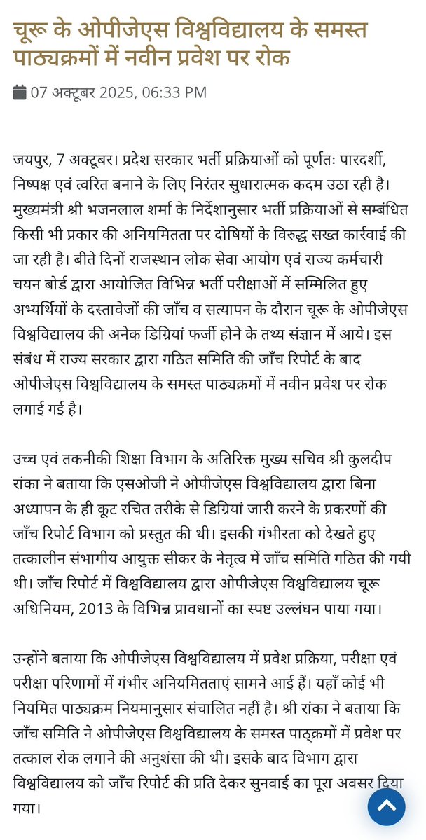 OPJS यूनिवर्सिटी को लेकर सरकार की प्रेस विज्ञप्ति सवाल- मुख्यमंत्री @BhajanlalBjp जी इस यूनिवर्सिटी ने 2018 में भी फर्जीवाड़ा किया। सच छिपाने के लिए आग में रिकॉर्ड जलने की कहानी भी बनाई। 2022 में भी फर्जी डिग्री बांटी फिर ऐसी यूनिवर्सिटी की मान्यता रद्द क्यों नहीं?