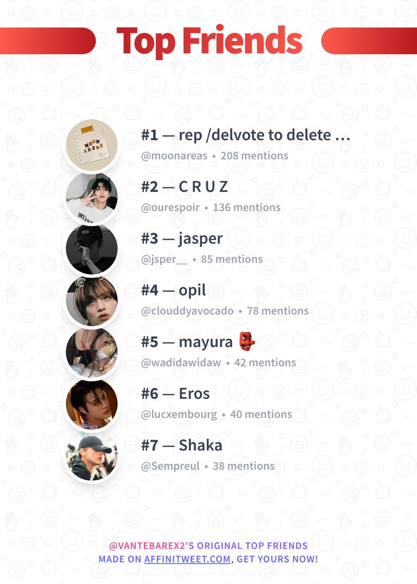 ✨ Top Friends 🥇 moonareas 🥈 ourespoir 🥉 jsper__ 🏅 clouddyavocado 🏅 wadidawidaw 🏅 lucxembourg 🏅 Sempreul ➡️ affinitweet.com/top-friends