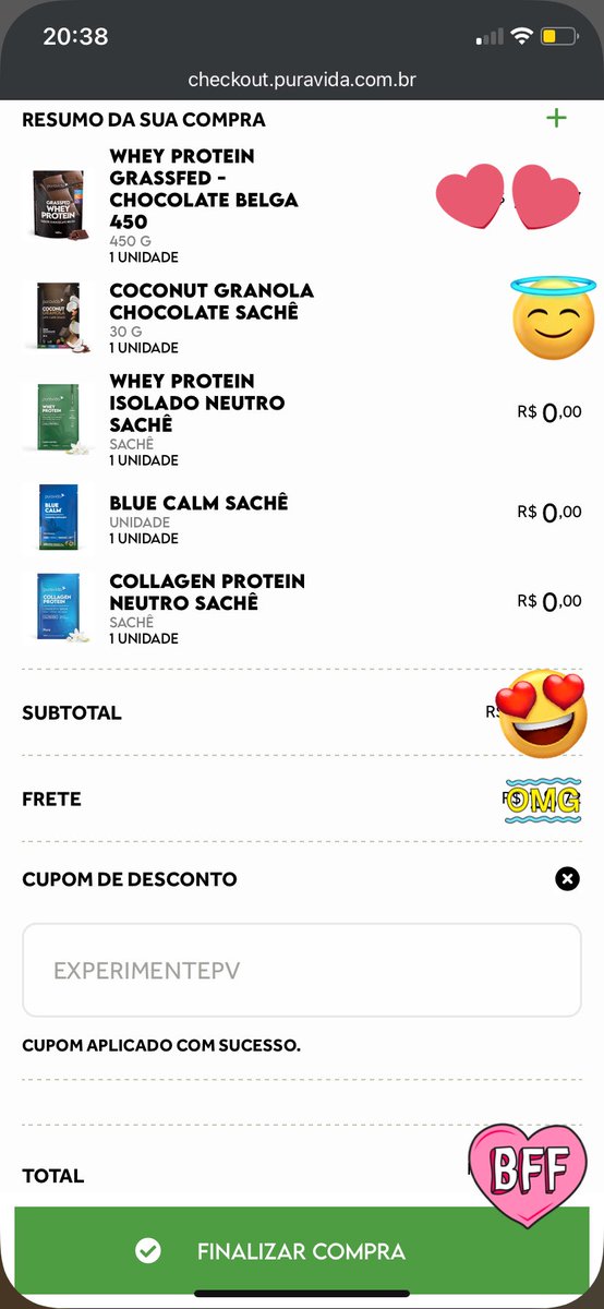 AMO cupom de desconto e promoção (ia pagar só pelo whey, mas acabei pagando a mais porque faltava só 9 reais pra eu ter direito a 3 saches de brinde🤩