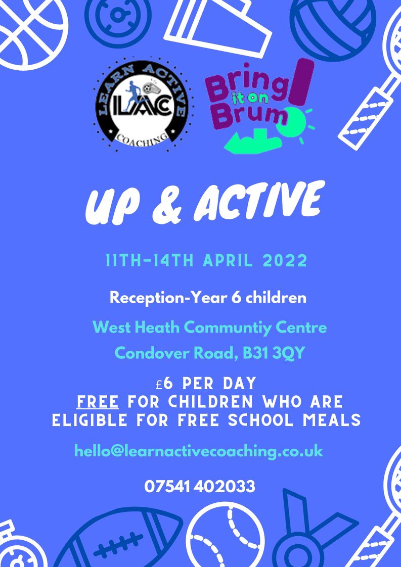 Places are free for children who are eligible for Free School Meals and include a nutritious meal. Places can be booked through the bring it on brum website. ⭐️ learnactivecoaching.coordinate.cloud for more information contact Malachi 📞 07541402033 📧 [email protected] 2/2