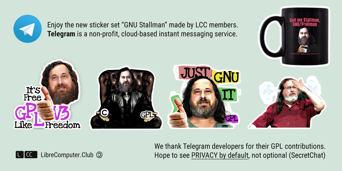 Enjoy new sticker set “GNU Stallman” made by LCC art force. We thank @durov & @telegram developers for their GPL contributions 😘. Hope to see PRIVACY by default (E2EE)🗨️🔑, not optional (SecretChat). May the source be with you! ✌️🤓 t.me/addstickers/Gn…