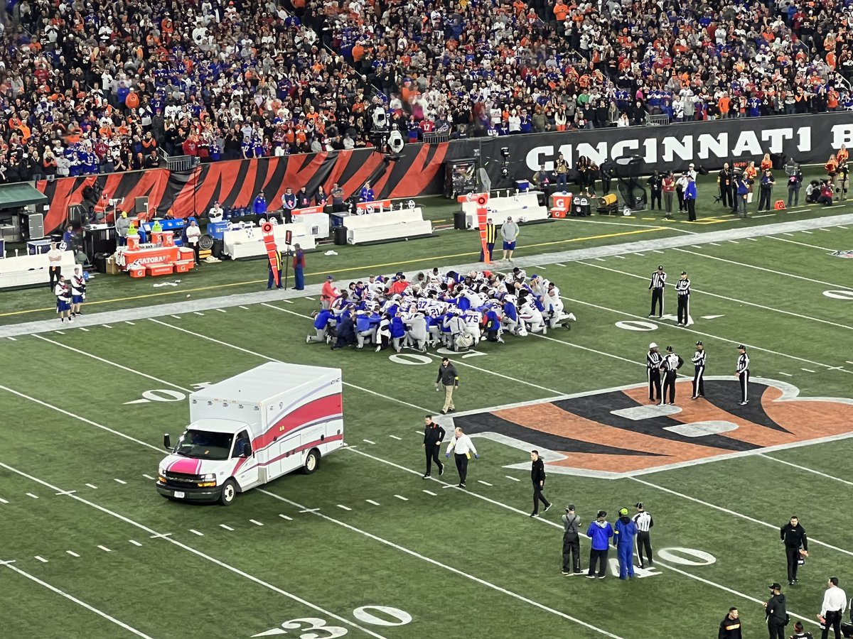 Entire Bills team down on their knees in a group prayer as Damar Hamlin leaves the field in an ambulance.