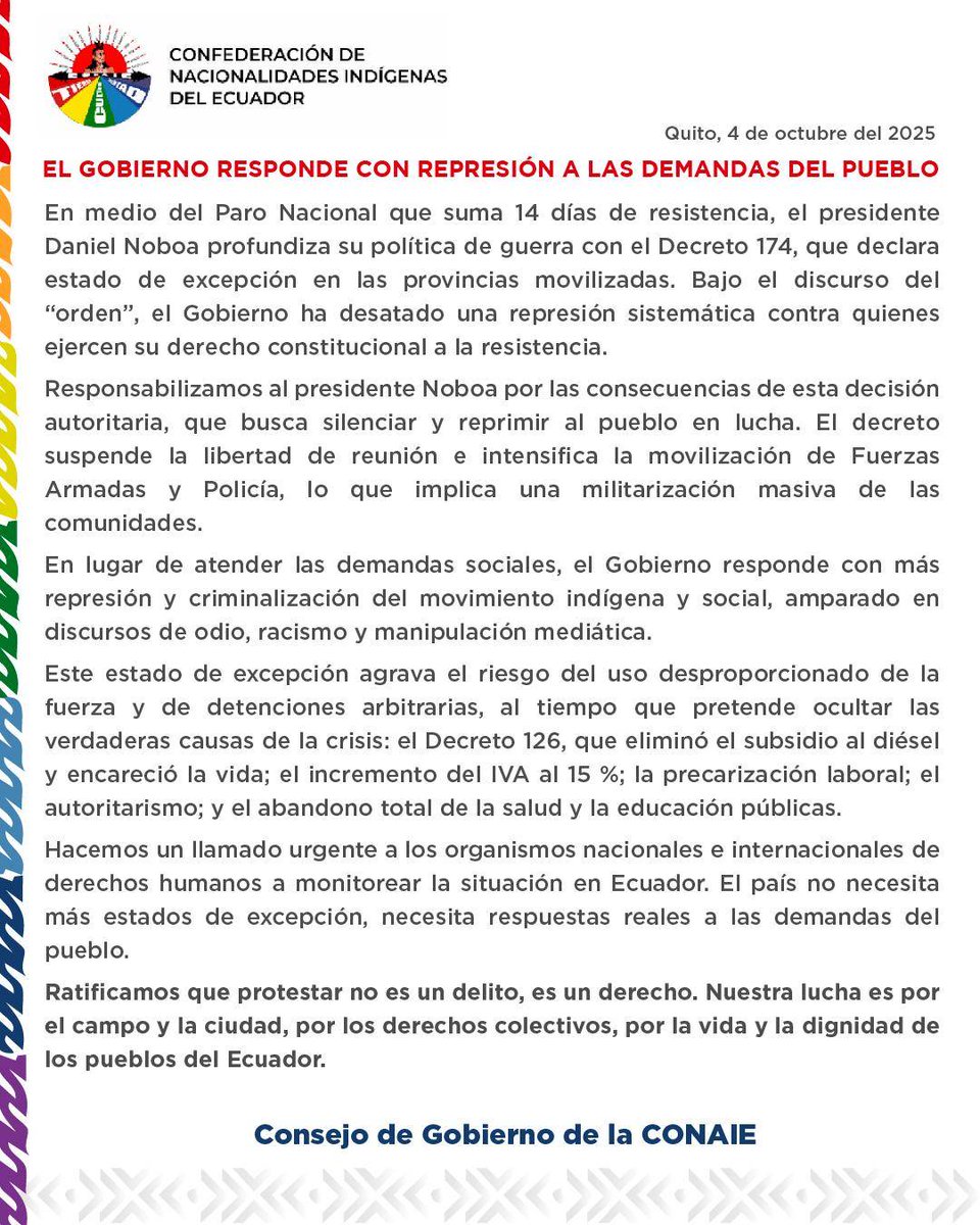 Denunciamos cómo las fuerzas armadas impiden el legítmo derecho a la protesta del pueblo movilizado en la provincia de Cotopaxi, restringiendo a nuestras comunidades el salir a elevar su voz de rechazo a las medidas económicas que atentan contra toda la población y sobrevolando…